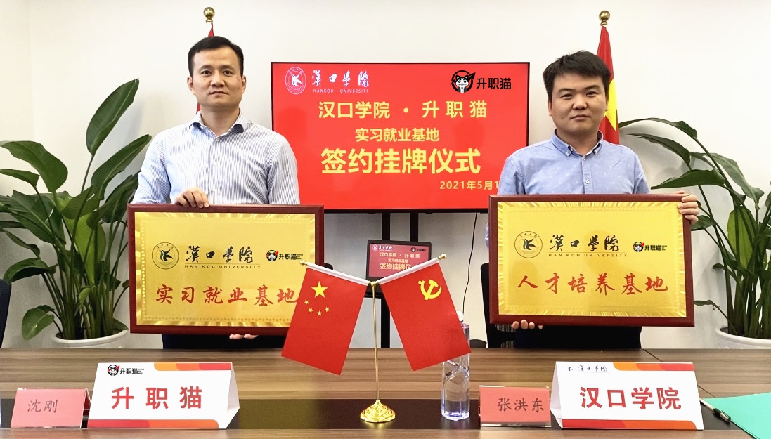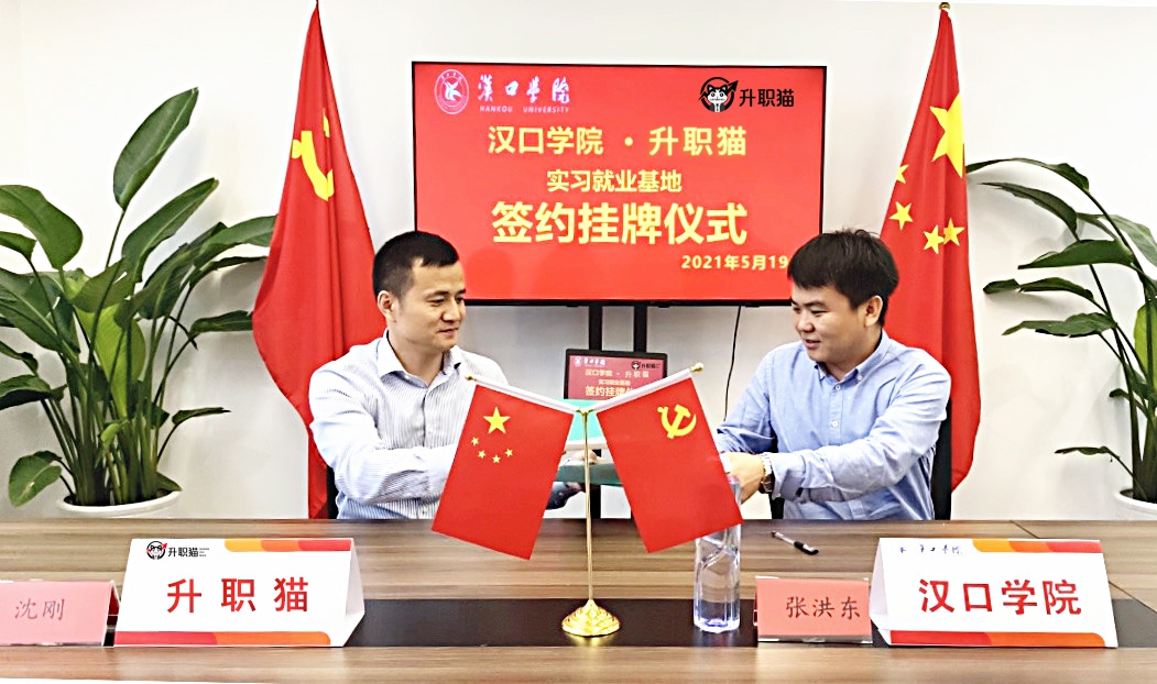 2021年5月19日,升职猫与汉口学院合作共建“就业实习基地”,签约挂牌仪式在武汉升职猫公司隆重举行。